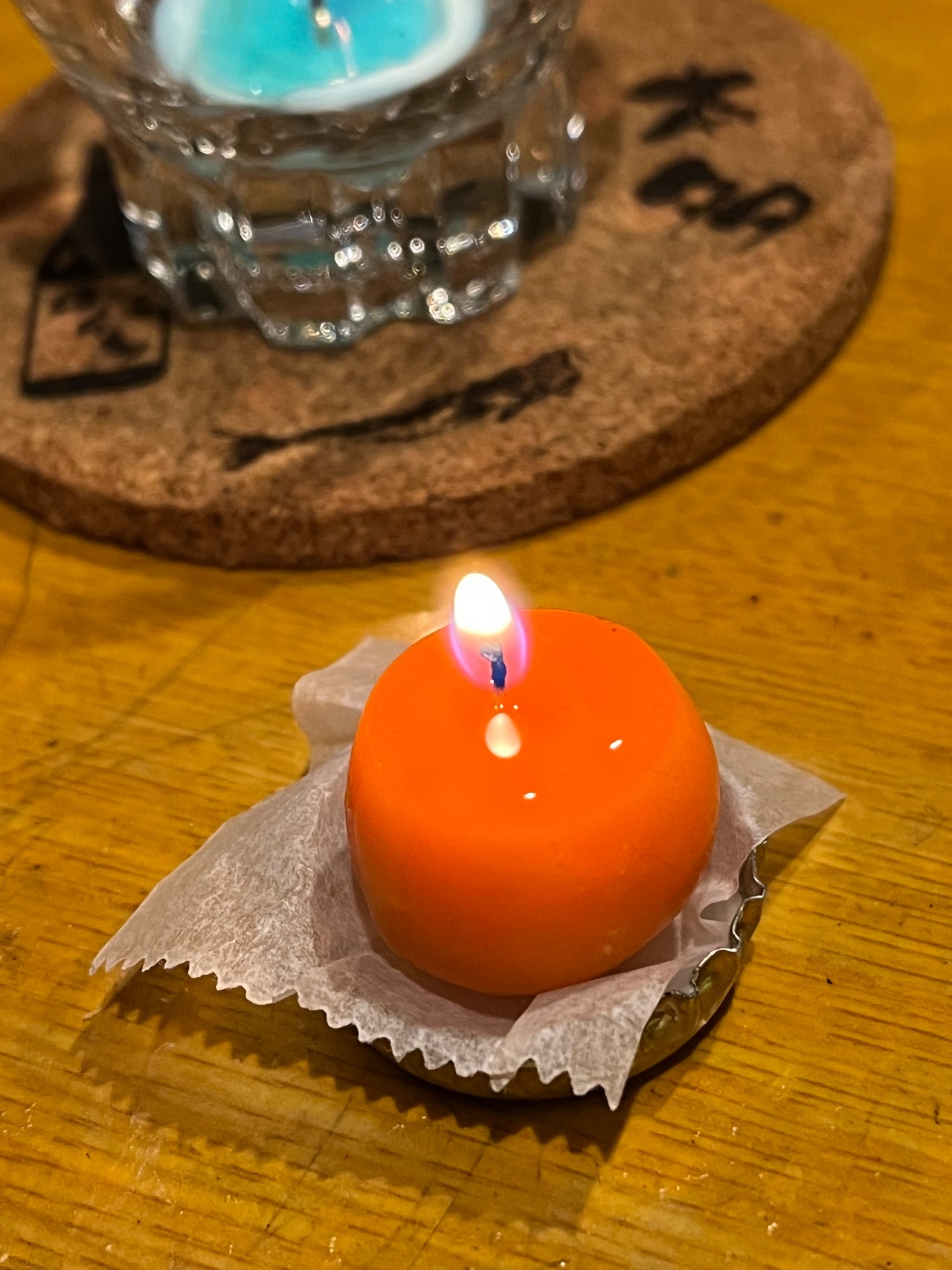 瓶の王冠にキッチン・シートを敷くと良い小皿になります。別売のコースターや写真のキャンドルグラスも同様に使用できます。火を消す際はピンセットなどで芯をロウに浸すとススを出さず消すことができます。残ったロウは燃えるゴミですが、芯を追加して再利用もできます。