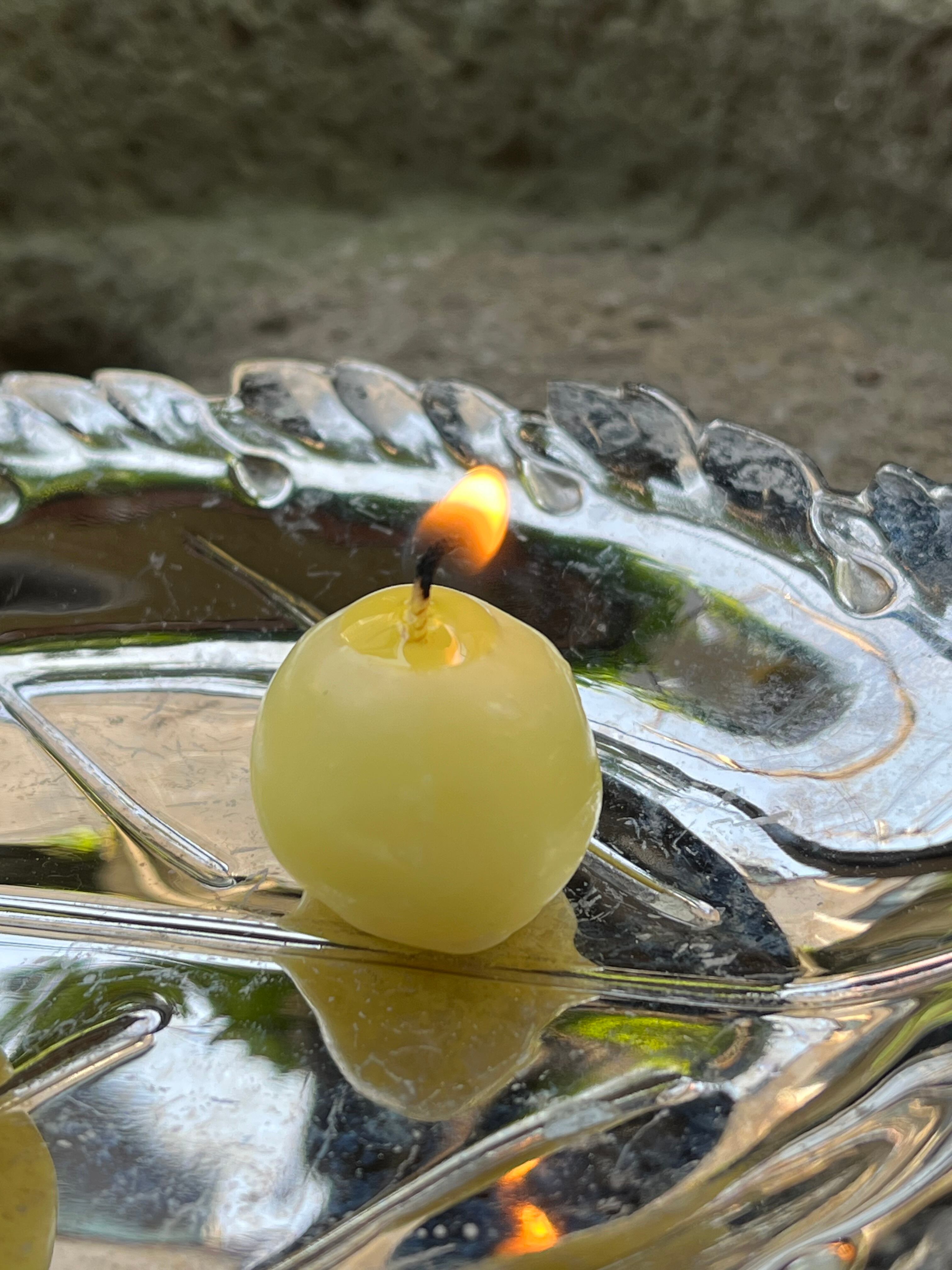 材料は蜜蝋 Bees Wax と 豆 Soy Wax の自然素材100%ブレンドで化学品は一切含んでいません。これらの素材は環境にやさしく、ススが出にくく空気の浄化が多少あると言われています。やわらかな燃え方で燃焼時間はパラフィン製よりも長く、形が崩れないように皿を敷くことで30分以上楽しめます。本来のキャンドル機能である燃焼を意識した木の実の形であり、無駄のない構造から座金無しとしています。皿無しで立たせたままでも10分程度は燃焼します。