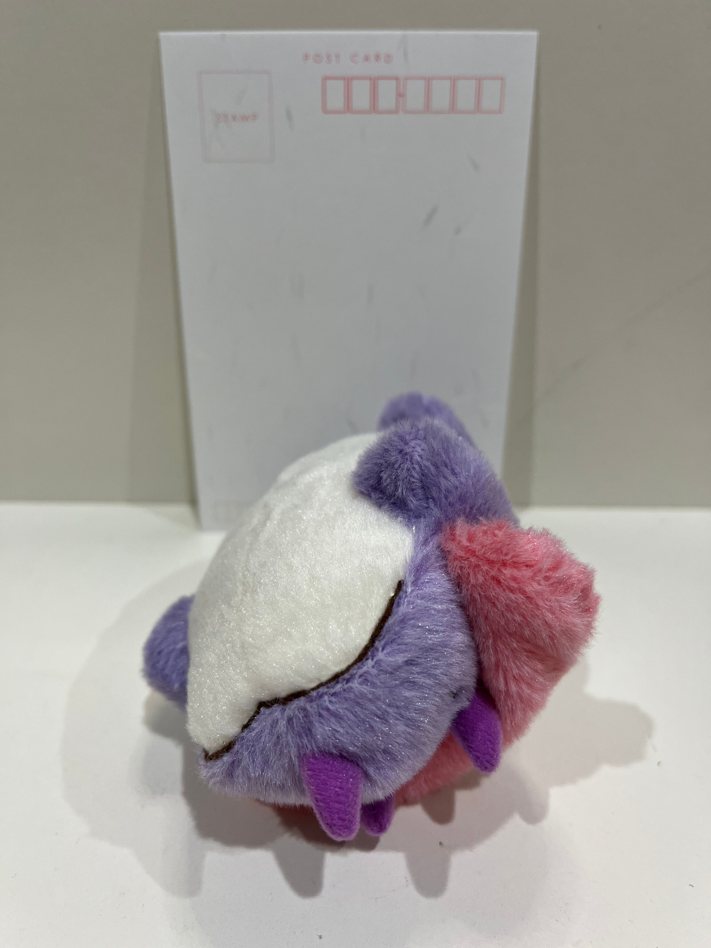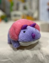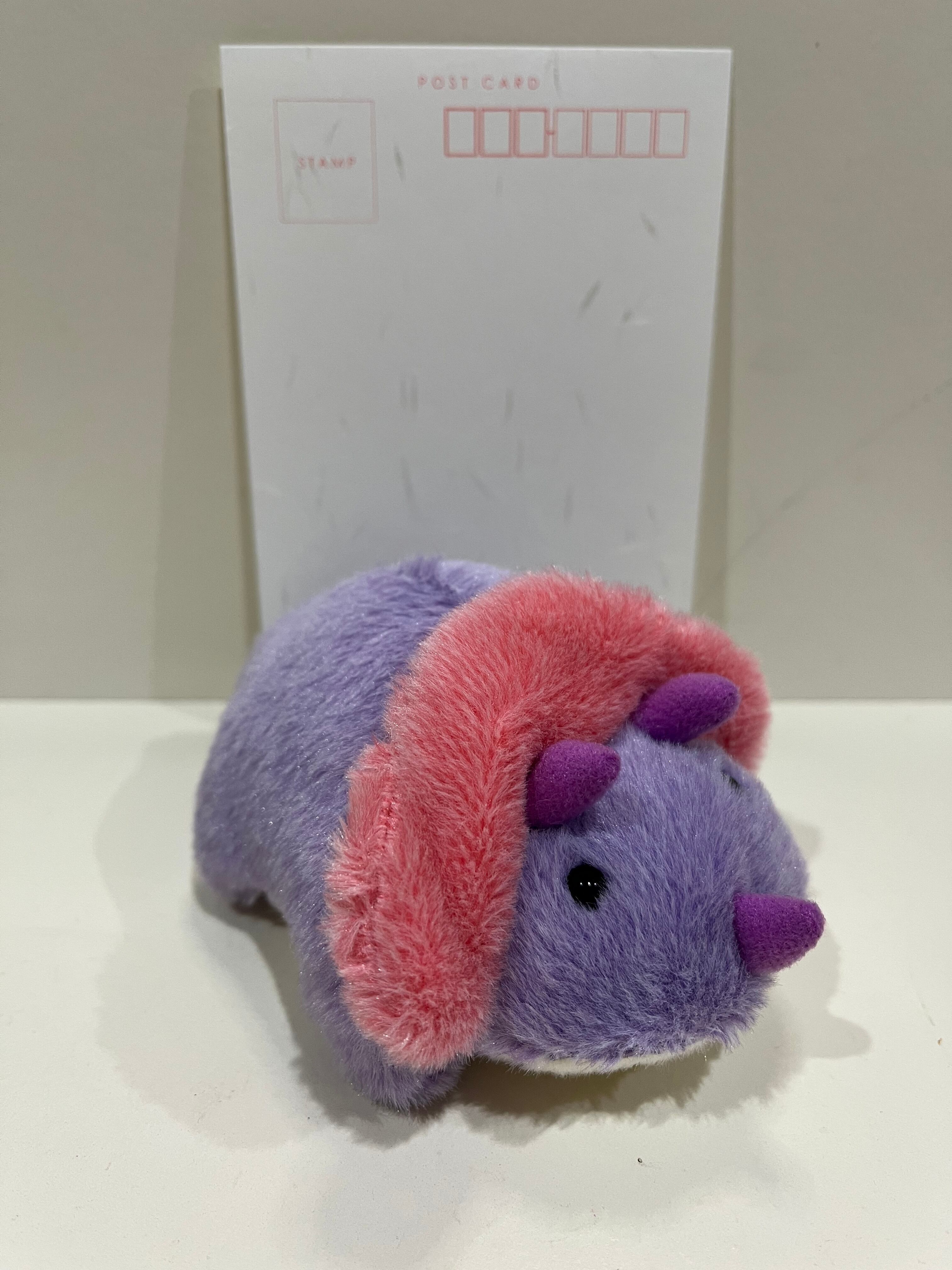 愛嬌のある表情のパステルパープルのトリケラトプス。ピンクのえりかざりと三本の角が魅力です。